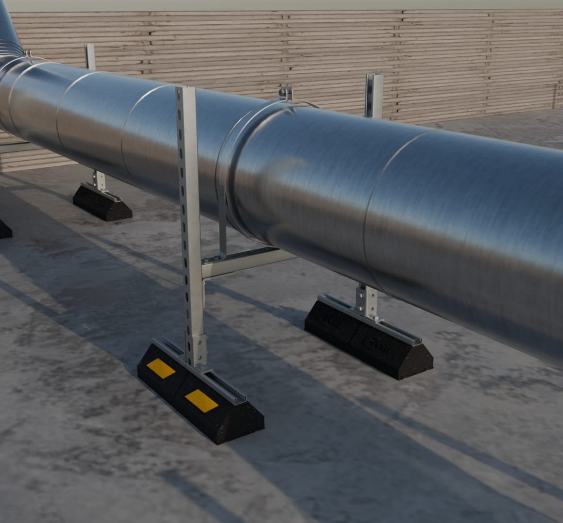 The DS Duct Support Series is a non-penetrating rooftop support designed to support HVAC ductwork. It features fixed dimensions for quick installation, double CXP2 bases for increased stability, 4-hole 90° fittings for crossbeam support, and 8-hole wing fittings that connect the vertical struts to the bases. It is suitable for most types of roofing materials or other flat surfaces.