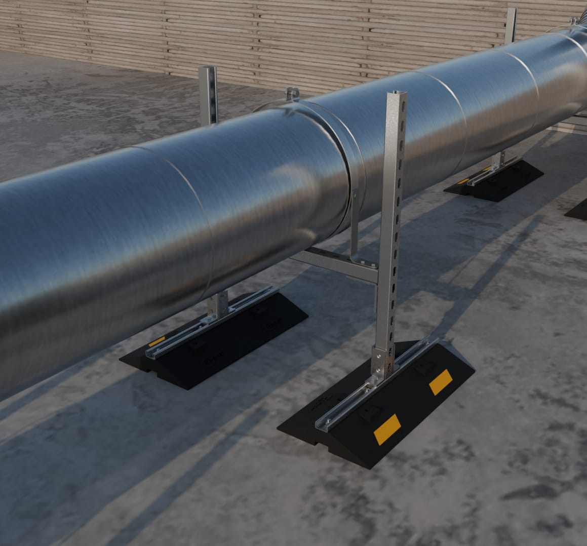 The DSW Duct Support Series is a non-penetrating rooftop support designed to support HVAC ductwork. It features fixed dimensions for quick installation, double CXW24 bases for increased stability, 4-hole 90° fittings for crossbeam support, and 8-hole wing fittings that connect the vertical struts to the bases. It is suitable for most types of roofing materials or other flat surfaces.